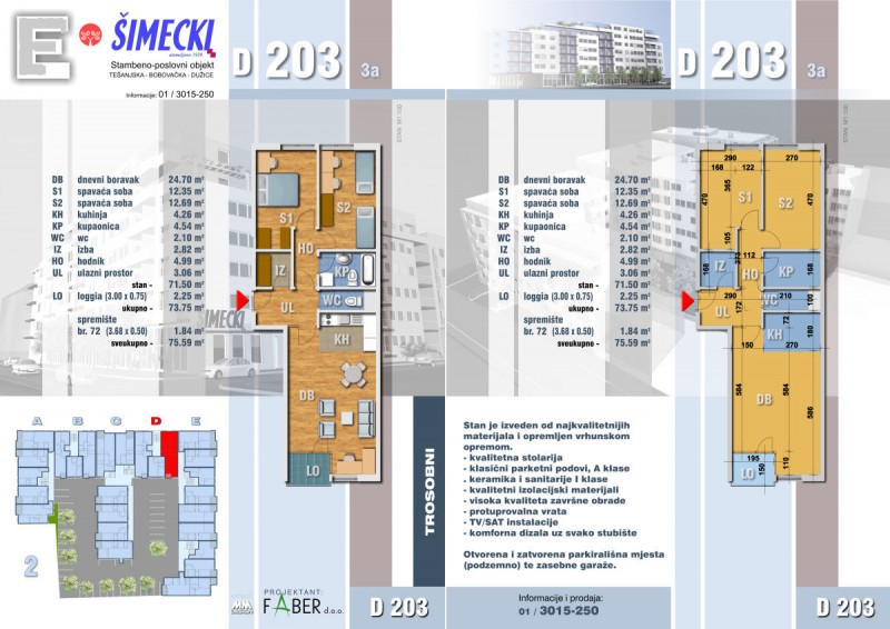 Pri izradi kataloga korišten je koncept obostranog A4 formata sa svim bitnim informacijama o stanu i građevini na istom listu kako bi se omogućilo i izdvajanje iz cjeline, odnosno umnožavanje u potrebnom broju primjeraka za svaki stan. Zbog veličine projekta odabrana je nešto jednostavnija 2D grafička obrada tlocrta umjesto punog 3D prikaza stanova.